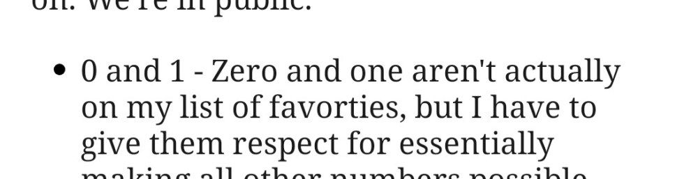 • 0 and 1 – Zero and one aren’t actually on my list of favorites, but I have to give them respect for essentially making all other numbers possible (and also out of professional obligation as a programmer).