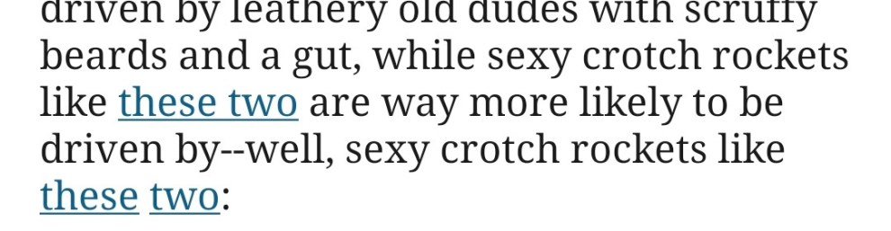 Is it just me, or is the attractiveness of a motorcycle directly correlated with the attractiveness of its rider? Like, it seems like choppers and Harleys are always driven by leathery old dudes with scruffy beards and a gut, while sexy crotch rockets like these two are way more likely to be driven by–well, sexy crotch rockets like these two: