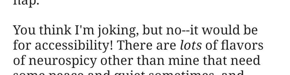 You think I’m joking, but no–it would be for accessibility! There are lots of flavors of neurospicy other than mine that need some peace and quiet sometimes, and there are also times when the best thing you can do for your productivity is…take a nap. Rest isn’t a sign of laziness! Also, you don’t keep lazy people from avoiding work just by banning lazy-seeming behavior! Productivity should be measured by (gasp) how much work you actually get done, not how much time you spend looking busy!