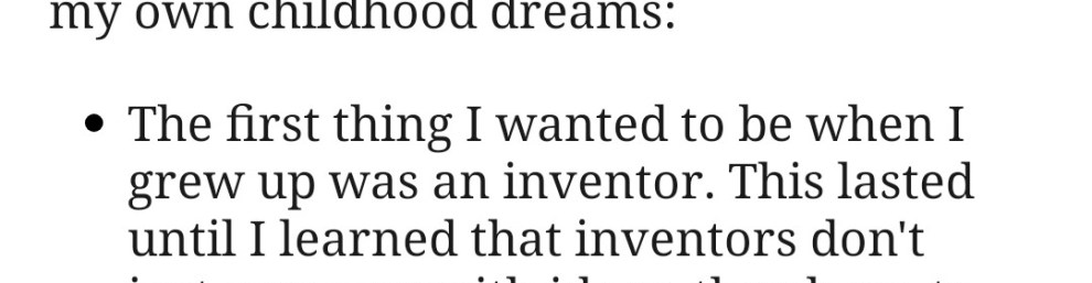 - The first thing I wanted to be when I grew up was an inventor. This lasted until I learned that inventors don’t just come up with ideas, they have to implement them as actual prototypes (or at least know enough engineering to make some diagrams and file a patent). Eventually, I figured out that “just coming up with ideas” is much closer to the definition of an artist, which is currently what I want to be when I grow up.