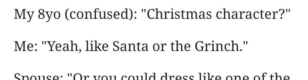 My spouse: “Hey sweetie, you get to dress up as your favorite Christmas character for school tomorrow. What do you want to go as?”