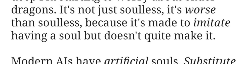 Modern AIs have artificial souls. Substitute souls. They’re the astroturf of art; the hydrogenated oil of human thought and creativity.
