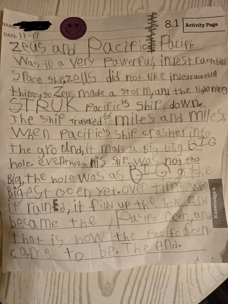 Pacific was in a very powerful, indestructible space ship. Zeus did not like indestructible things, so Zeus made a storm, and the lightning STRUCK Pacific’s ship down. The ship traveled for miles and miles. When Pacific’s ship crashed into the ground, it made a big big BIG hole. Even though his ship was not too big, the hole was as BIG as the biggest ocean yet. Over time when it rained, it filled up the hole and became the Pacific Ocean, and that is how the Pacific Ocean came to be. The end.