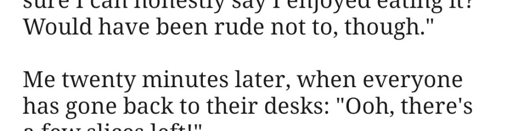 Me: “Man, that cake we got for my coworker’s birthday was pretty stale. Not sure I can honestly say I enjoyed eating it? Would have been rude not to, though.”
