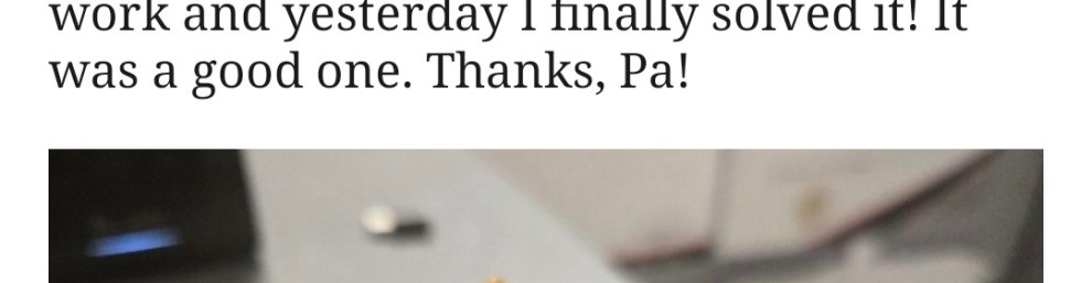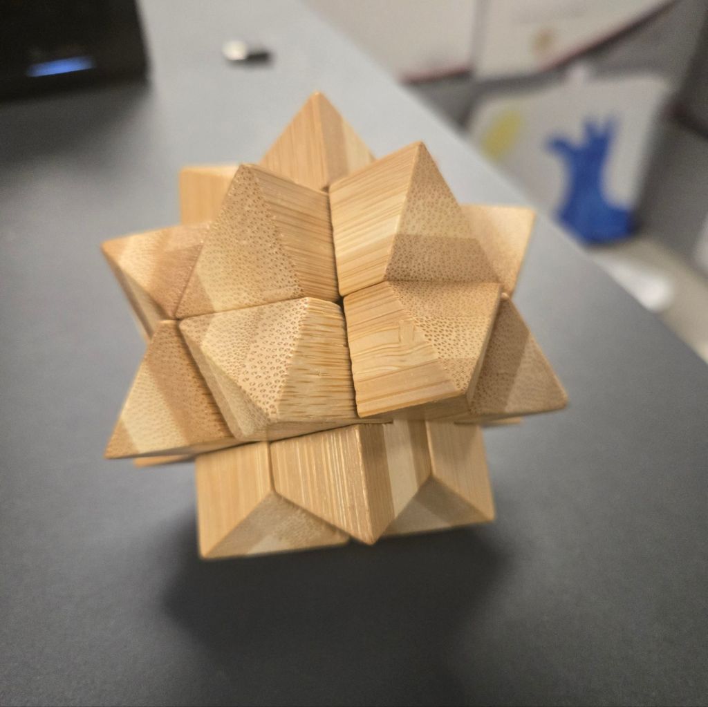 My father-in-law got me this puzzle for my birthday a few years ago. It’s been sitting in a box for most of that time, but two weeks ago I got it out and brought it to work and yesterday I finally solved it! It was a good one. Thanks, Pa!