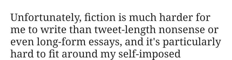 Unfortunately, fiction is much harder for me to write than tweet-length nonsense or even long-form essays, and it’s particularly hard to fit around my self-imposed requirement of posting daily. When I’m immersed in something I’m passionate about, it gets really difficult for me to focus on anything else for more than a few minutes at a time.