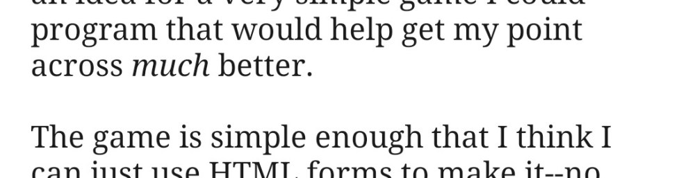The game is simple enough that I think I can just use HTML forms to make it–no JavaScript required–so it will be a good opportunity to practice with kelp, too. Most likely, I’ll have another devlog this week about why I’ve chosen to use kelp to redesign my website. I hope you’re looking forward to it!