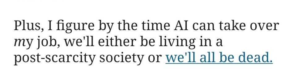 Plus, I figure by the time AI can take over my job, we’ll either be living in a post-scarcity society or we’ll all be dead.